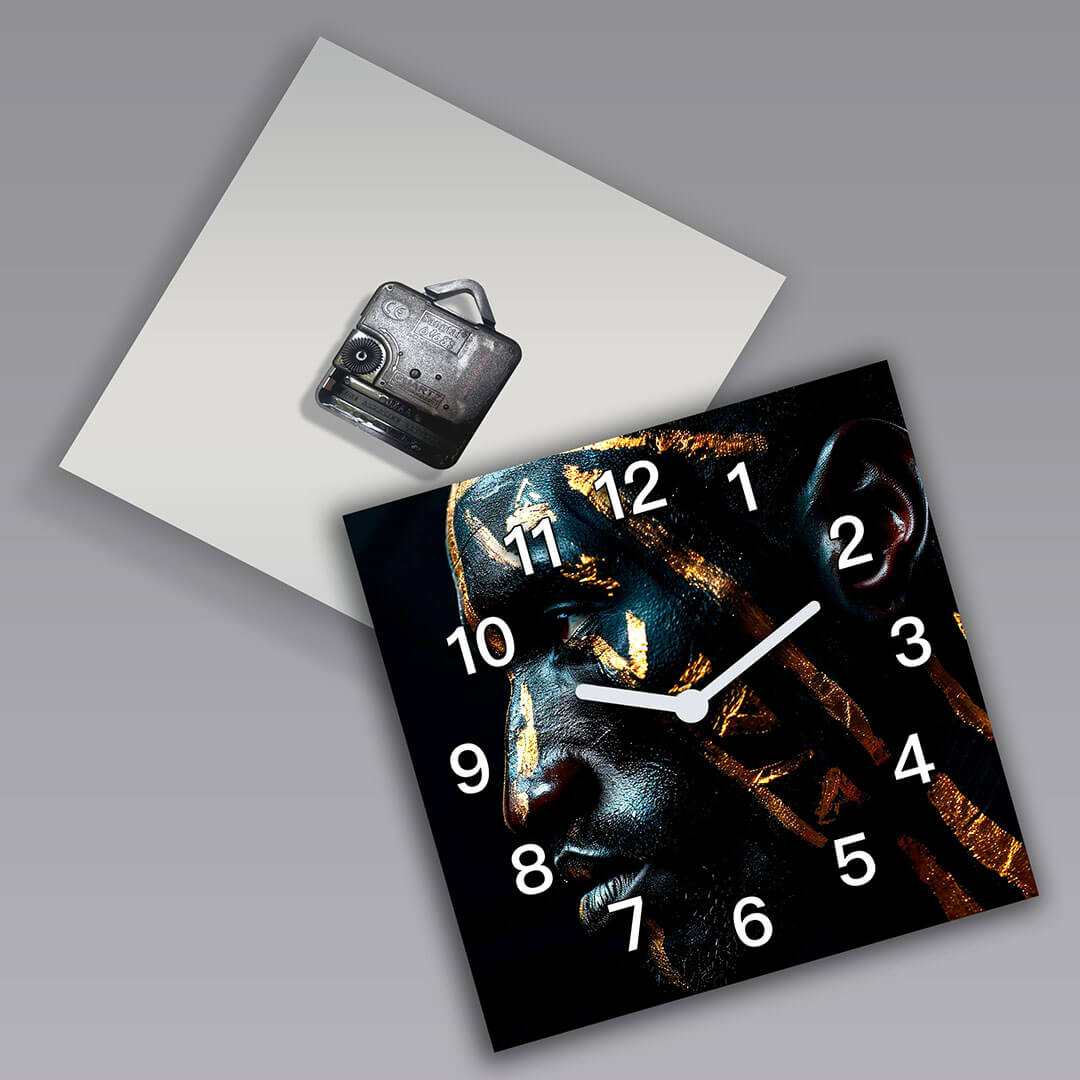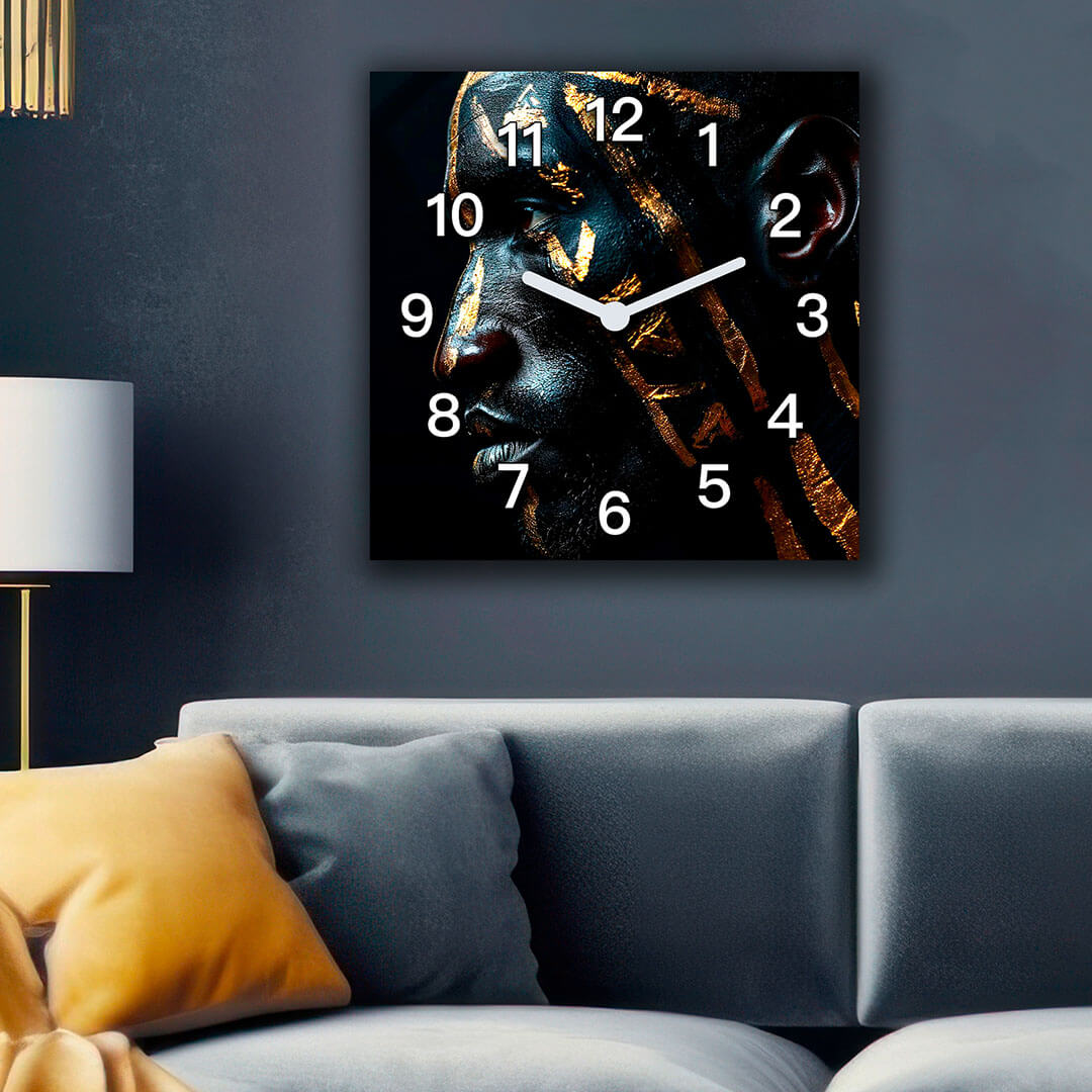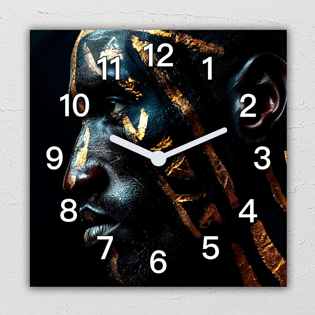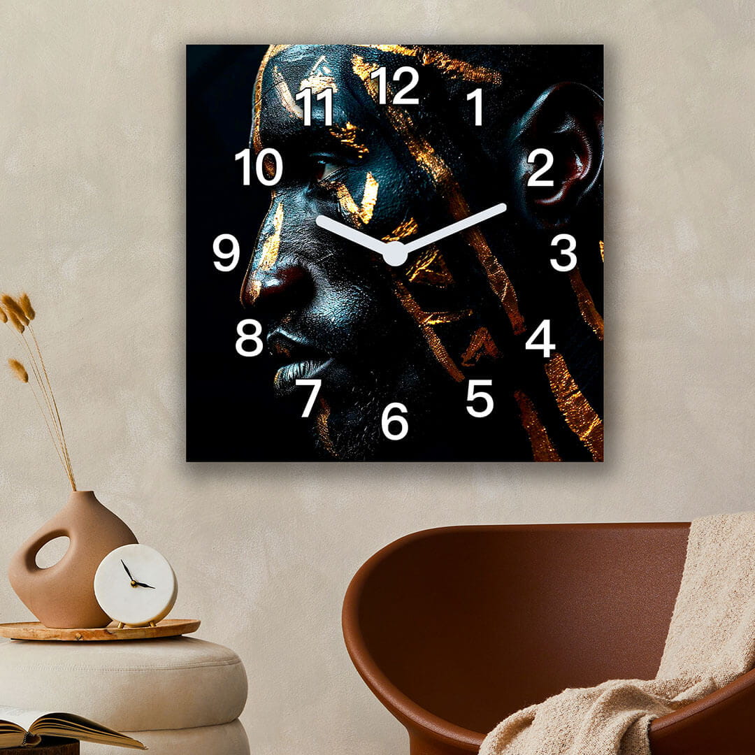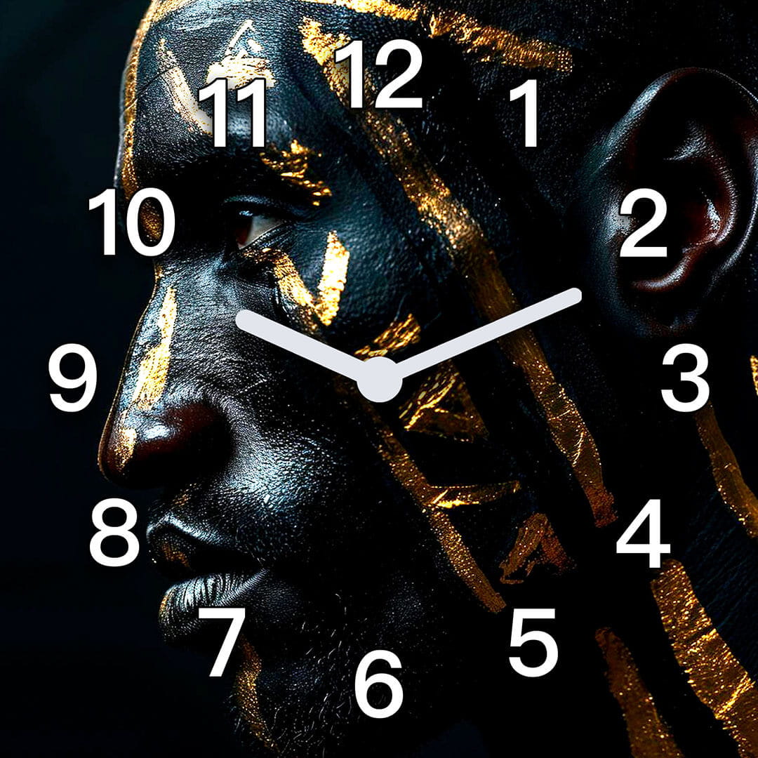 „Afrykański portret”. Ten zegar ścienny przedstawia portret mężczyzny z artystycznym malowidłem na twarzy, które łączy złote akcenty z ciemnym tłem. Wizerunek postaci, z wyraźnym naciskiem na kontury twarzy, symbolizuje głęboką refleksję i wewnętrzny spokój. Białe cyfry kontrastują z ciemnym tłem, podkreślając nowoczesny charakter zegara, który doskonale pasuje do współczesnych wnętrz. Zegar będzie doskonałym akcentem w pomieszczeniach takich jak salony, biura czy przestrzenie artystyczne, wnosząc do nich niepowtarzalny styl i głębię.
