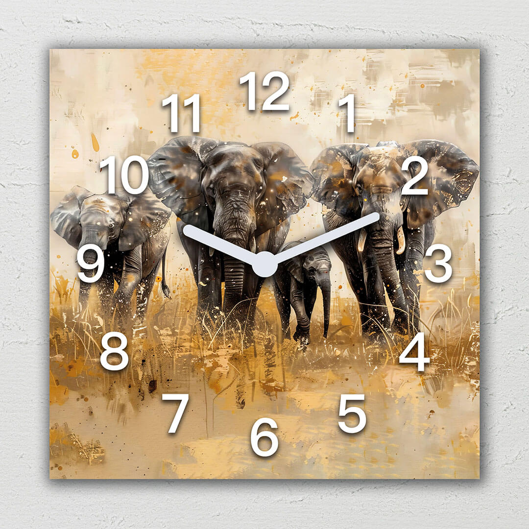 „Słonie w podróży przez Afrykę”. Ten zegar ścienny przedstawia majestatyczną scenę rodzinną słoni maszerujących razem przez afrykański krajobraz. Ciepłe odcienie złota, pomarańczu i brązu w tle tworzą spokojną, ale pełną energii atmosferę, symbolizującą więzi rodzinne i harmonię w przyrodzie. Białe cyfry wyraźnie wyróżniają się na tle, nadając zegarowi nowoczesny wygląd, który doskonale pasuje do współczesnych wnętrz. Zegar doskonale komponuje się w salonach, biurach czy przestrzeniach artystycznych, wnosząc wyjątkowy klimat natury oraz siłę więzi rodzinnych.