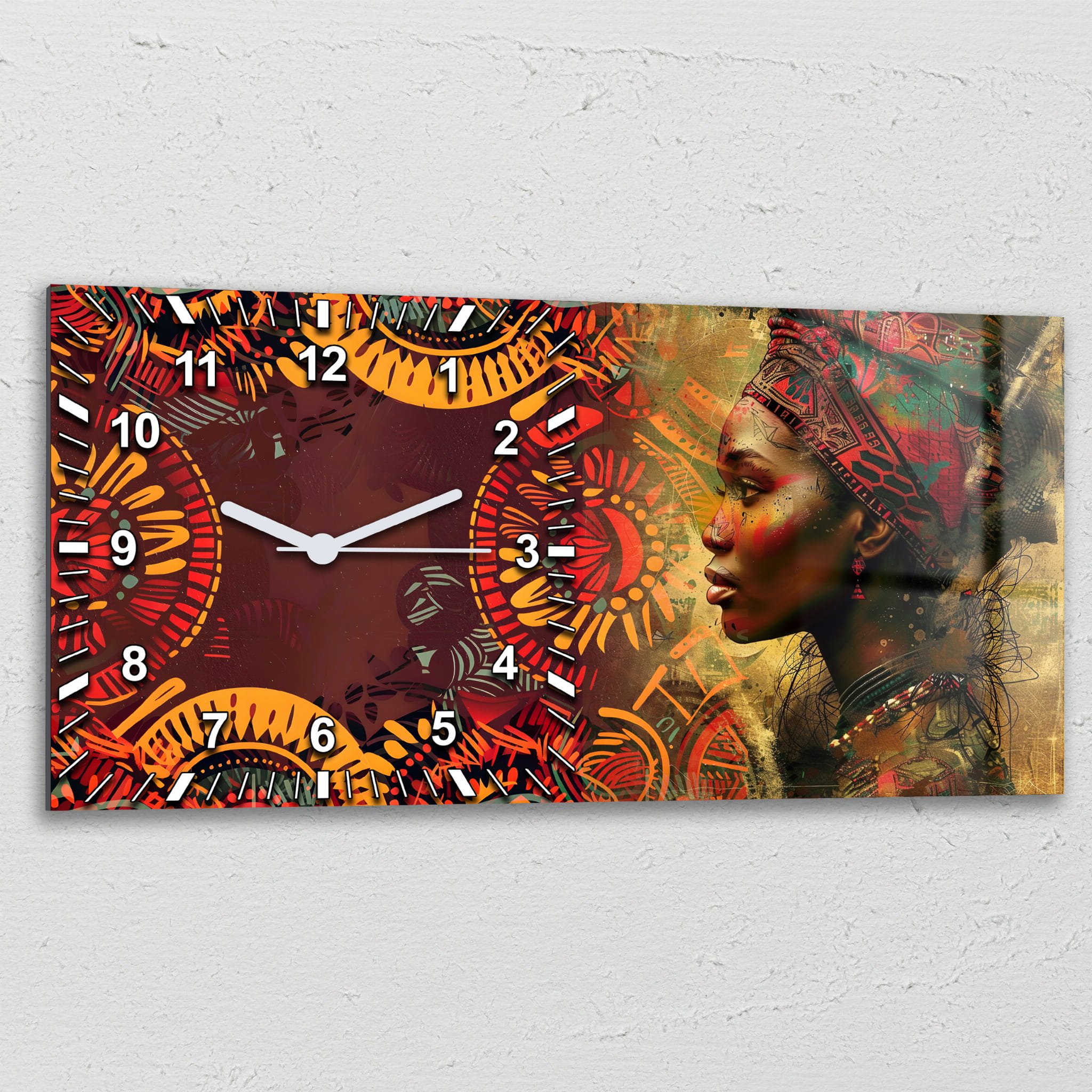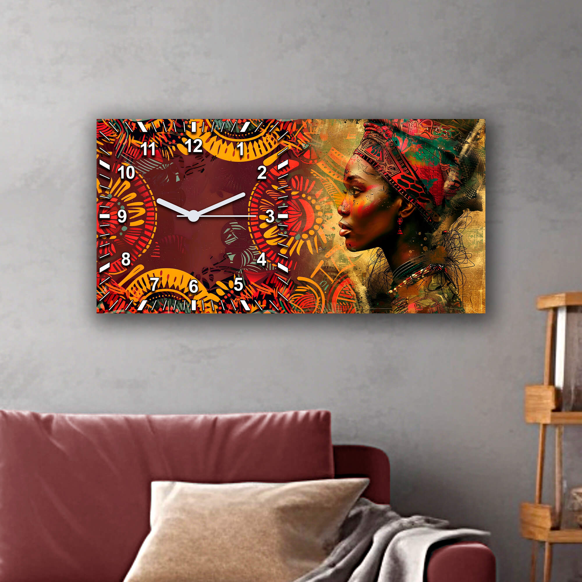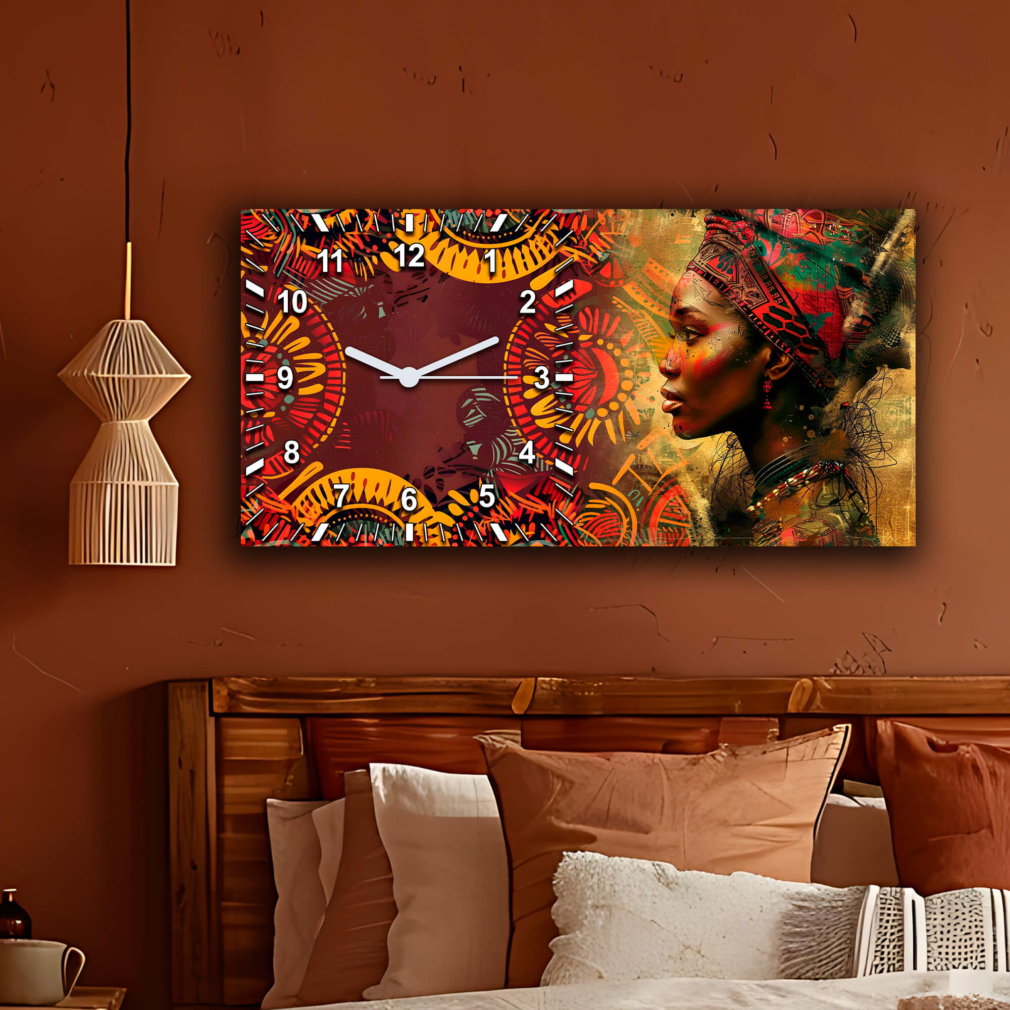 „Afrykańska kultura”. Ten zegar ścienny przedstawia profil majestatycznej kobiety, której wizerunek łączy elementy kultury afrykańskiej z nowoczesnym designem. Zastosowanie intensywnych kolorów, takich jak czerwień, złoto i zieleń, oraz artystyczne detale podkreślają siłę i mądrość przedstawionej postaci. Wyraziste białe cyfry kontrastują z dynamicznym tłem, tworząc nowoczesny i inspirujący akcent. Zegar będzie doskonałym elementem dekoracyjnym we współczesnych wnętrzach, takich jak salony, biura czy przestrzenie artystyczne, wnosząc do nich energię i niepowtarzalny charakter.
