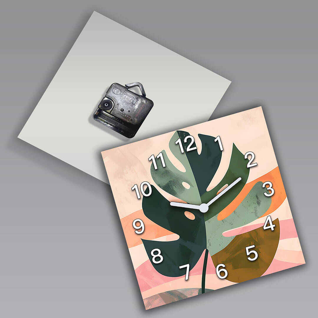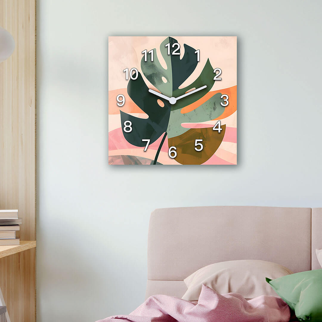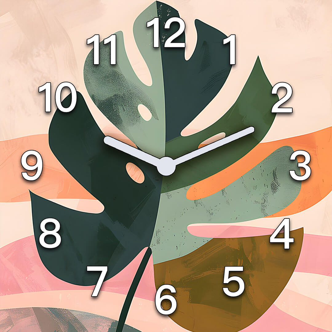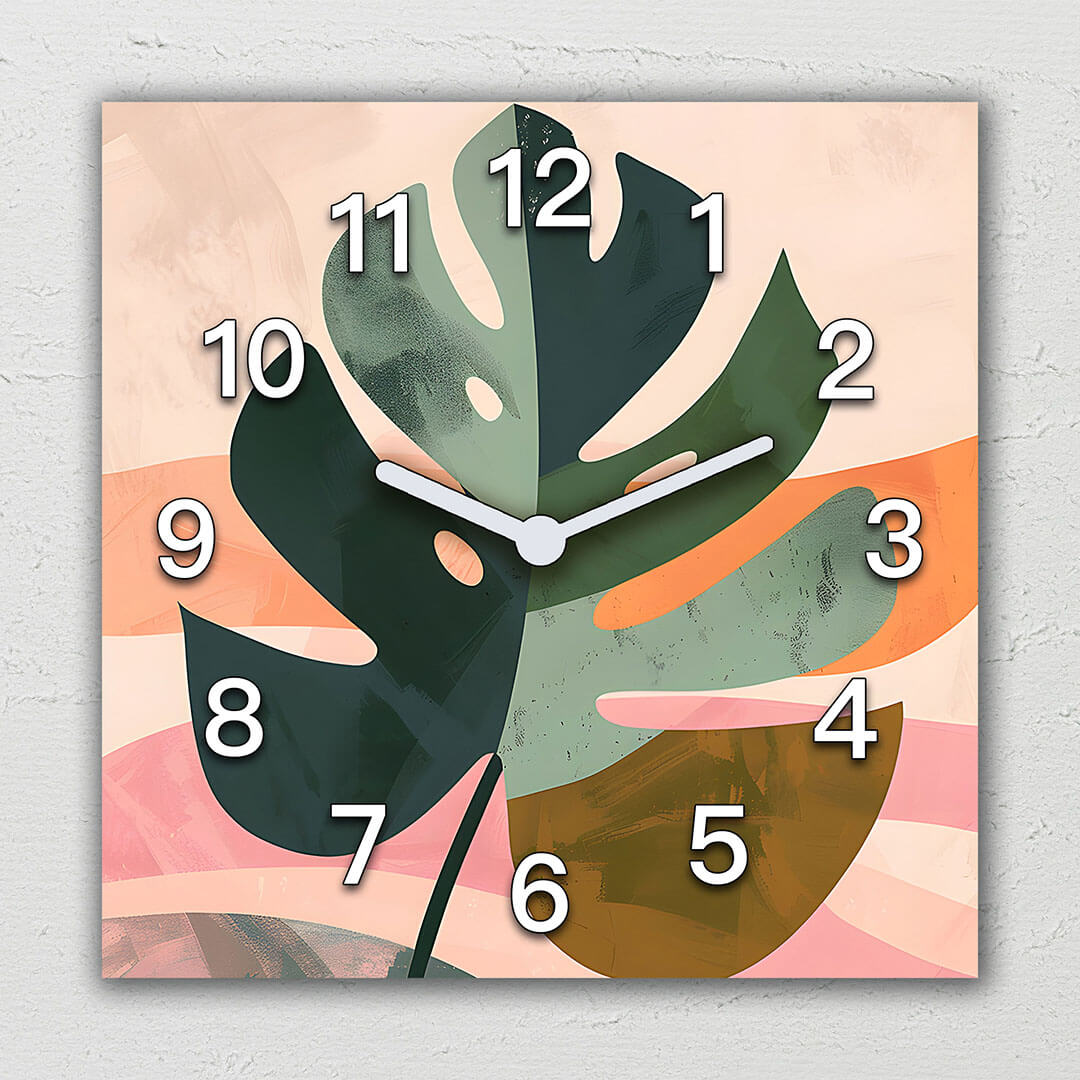 Dekoracyjny zegar ścienny „Abstrakcyjny liść” łączy w sobie elementy natury z nowoczesnym designem. Duże, wyraziste liście monstery na delikatnym tle w pastelowych odcieniach tworzą harmonijny i spokojny wygląd. Liście wykonane są w różnych odcieniach zieleni i oliwki, które podkreślają naturalne piękno i dodają głębi kompozycji. Delikatny kontrast z ciepłymi pastelowymi kolorami tła – delikatną brzoskwinią i różem – nadaje zegarkowi miękki, ale energetyczny wygląd. Białe cyfry wyraźnie wyróżniają się na tle, tworząc stylowy i nowoczesny wygląd. Zegar ten będzie świetnym dodatkiem do nowoczesnych wnętrz, dodając do pomieszczenia elementy natury i stylowego designu.