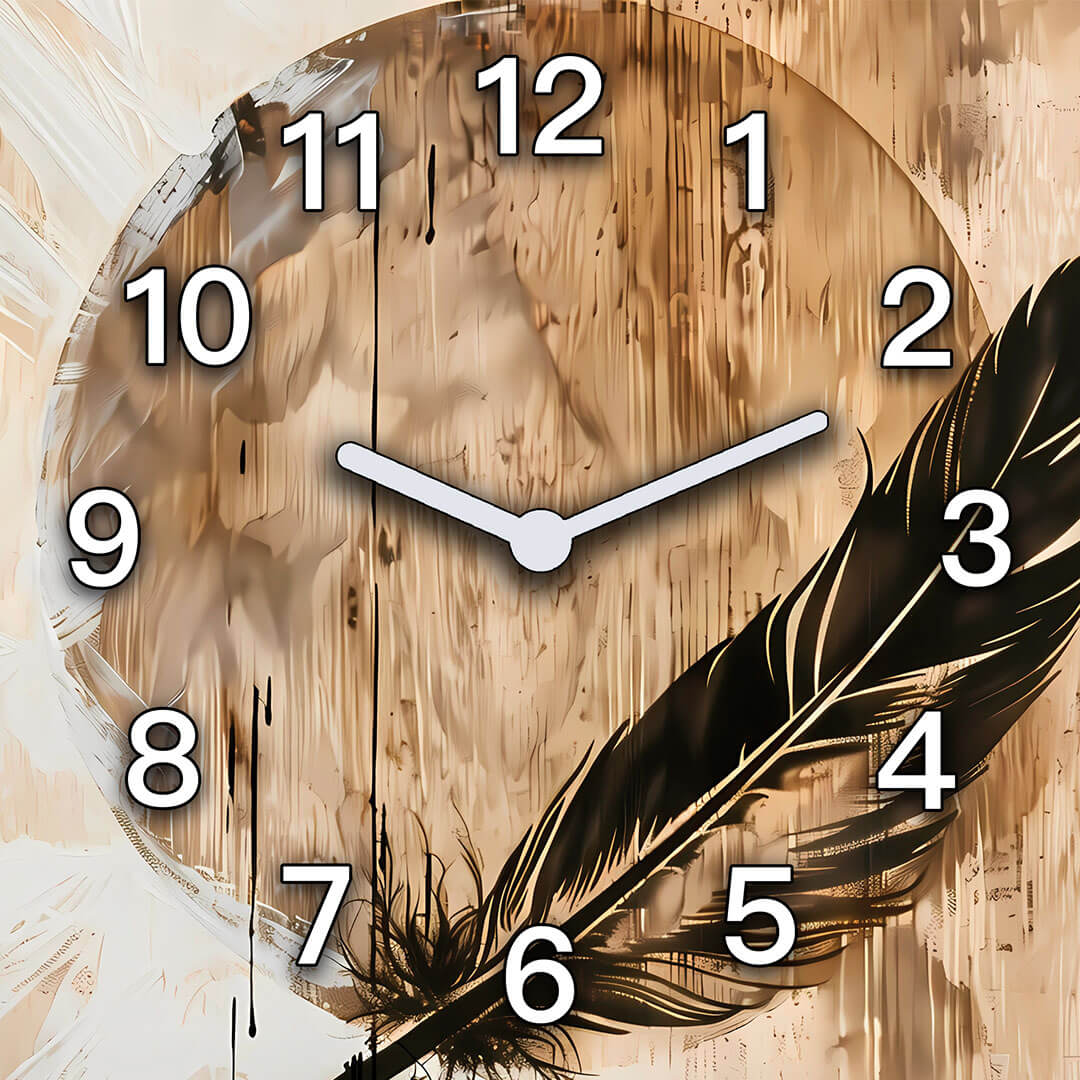 Dekoracyjny zegar ścienny „Artystyczne pióro” łączy w sobie elementy elegancji i naturalnego piękna. Motywem przewodnim zegara jest kontrast pomiędzy czarnymi piórami a delikatnym beżowym tłem. Pióra przedstawione na tle drewnianej faktury dodają zegarkowi wyrafinowania i miękkości, tworząc atmosferę spokoju i naturalnego ciepła. Linie i kolory tła podkreślają elegancki i minimalistyczny styl, czyniąc zegarek stylowym akcentem w każdym wnętrzu. Duże białe cyfry wyraźnie wyróżniają się na tle, nadając zegarkowi nowoczesny wygląd i ułatwiając odczytanie godziny.