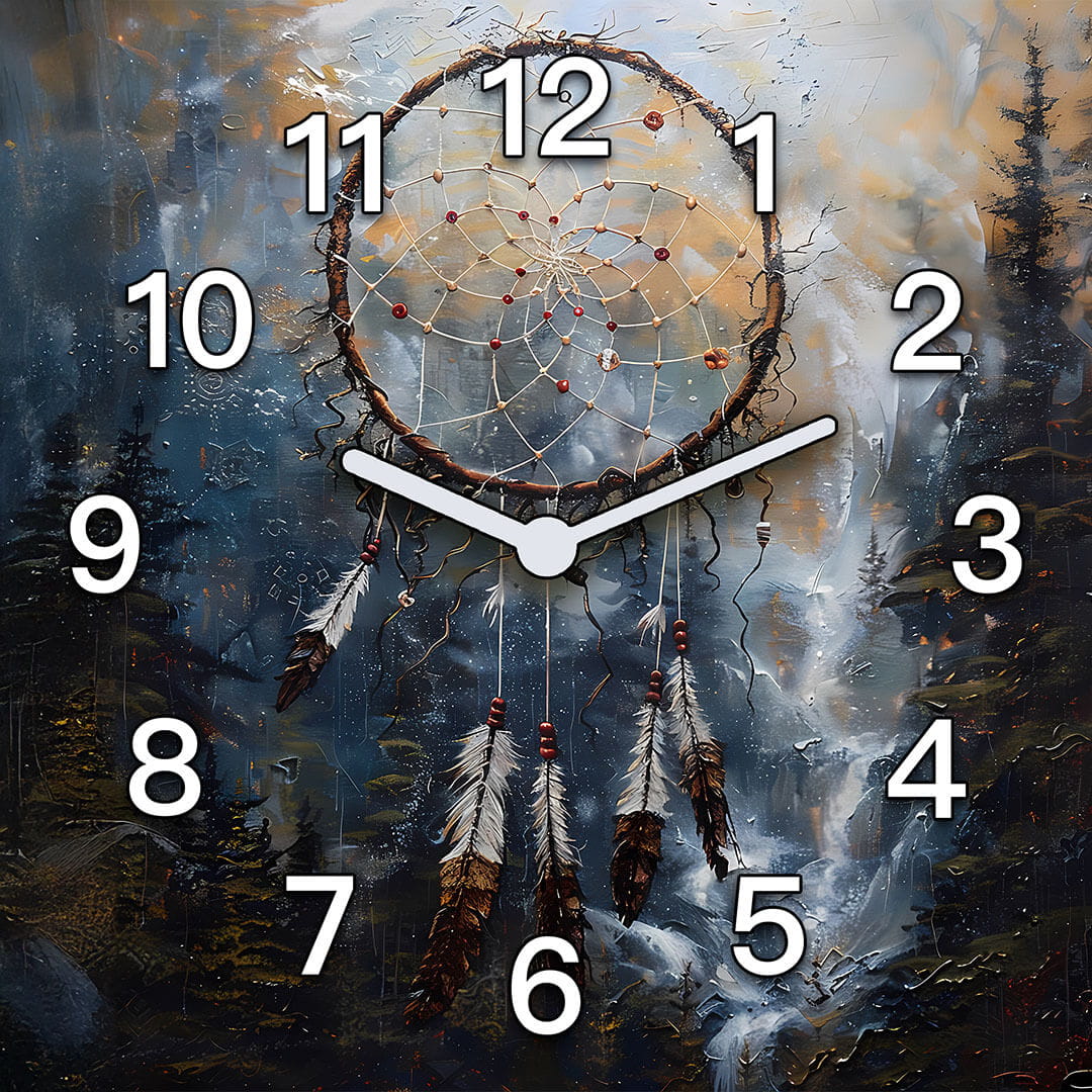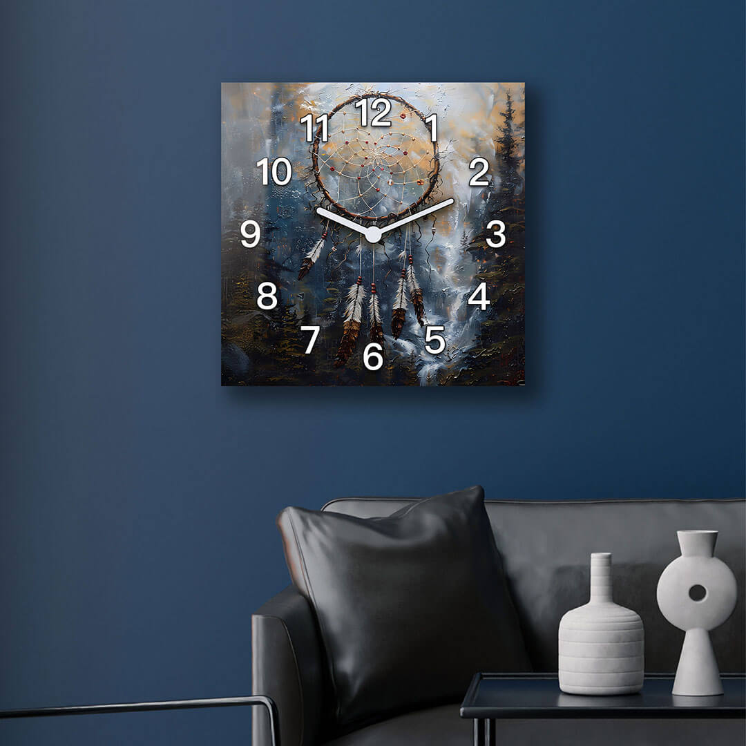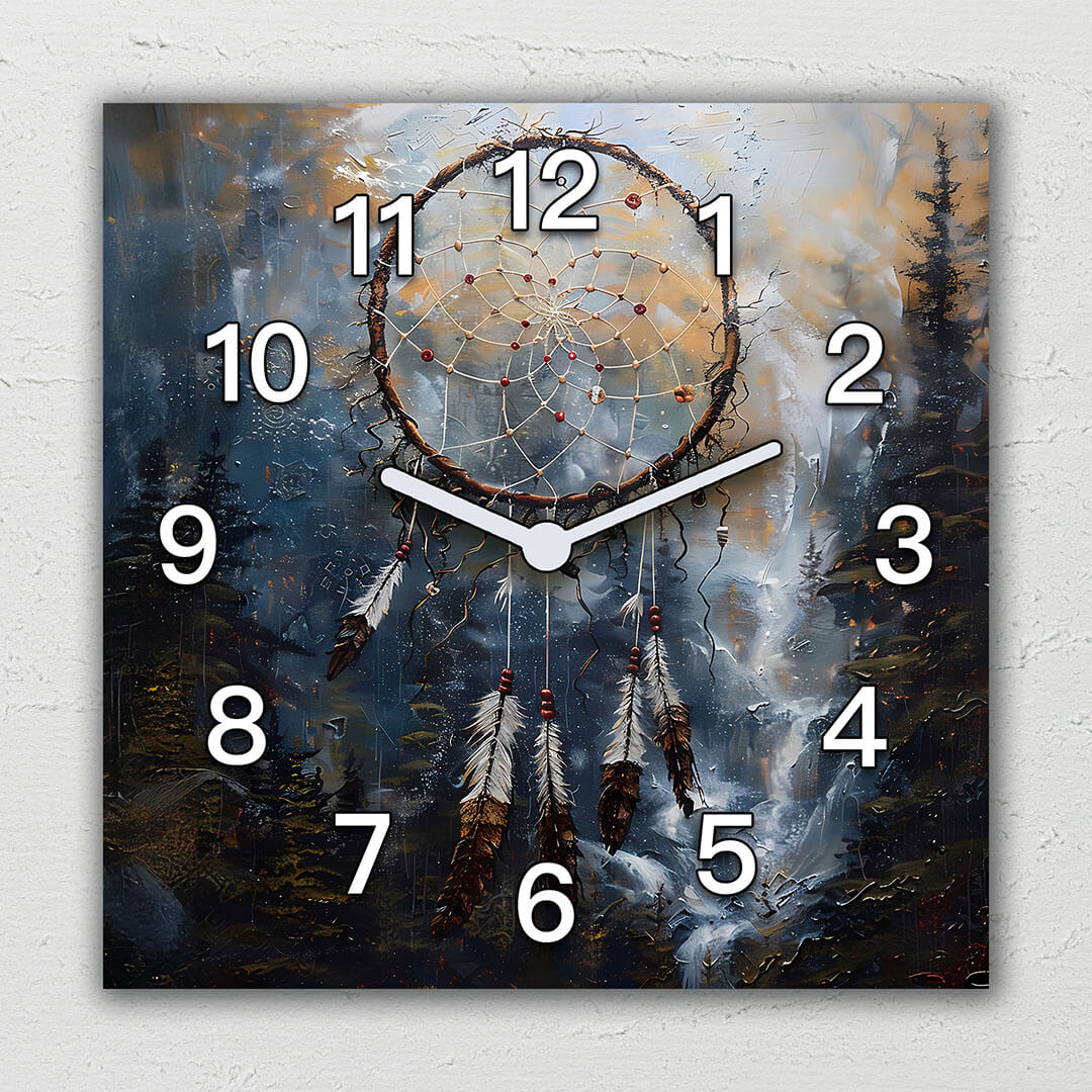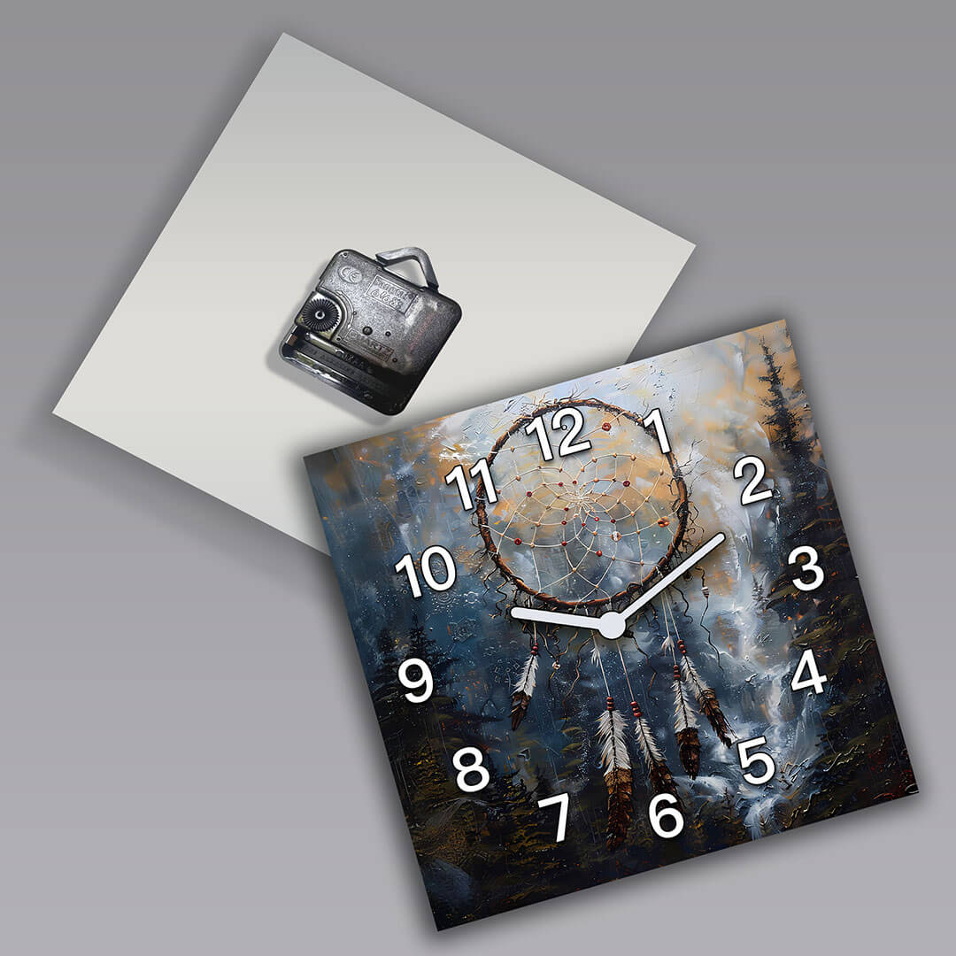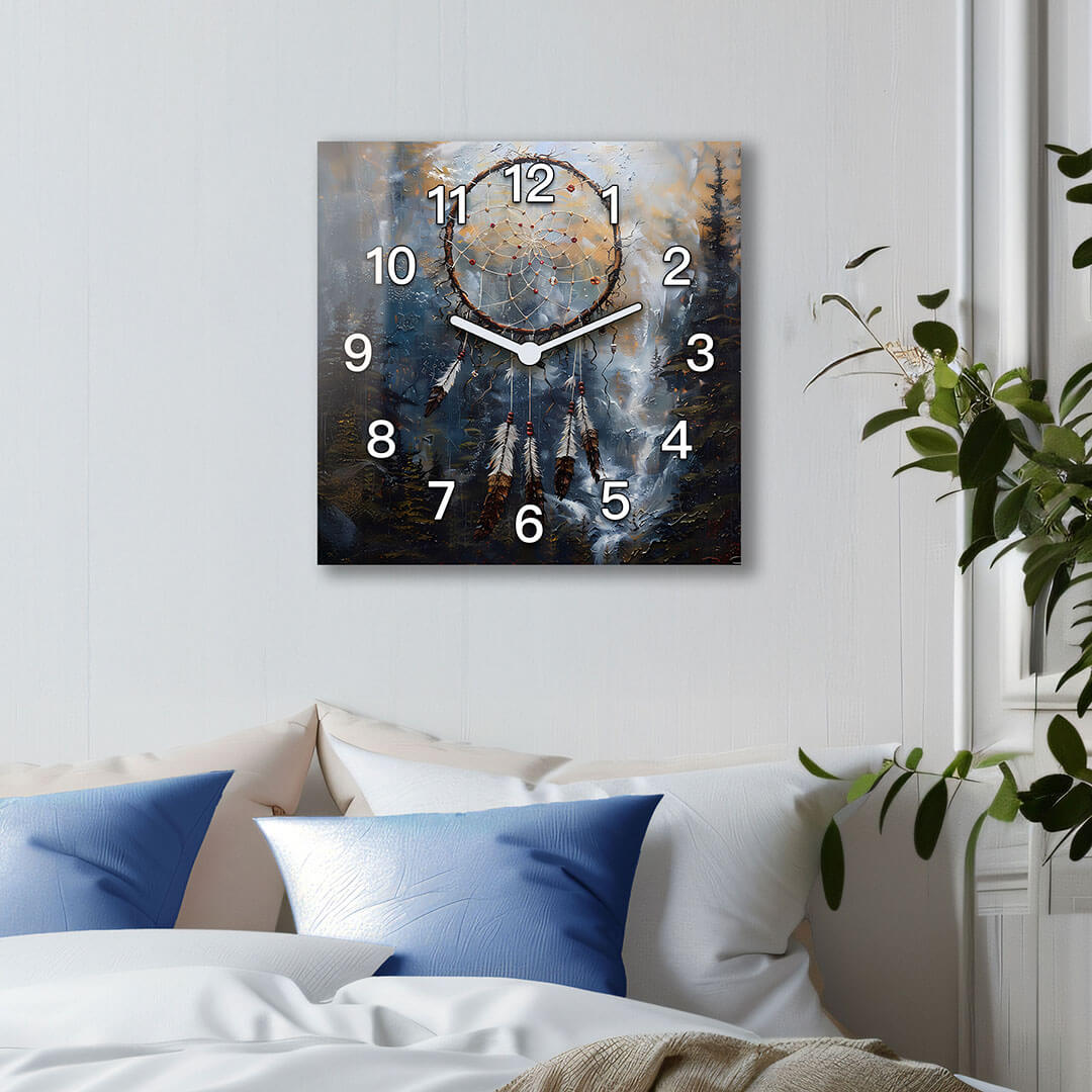 Dom • Katalog • ZEGARY ŚCIENNE • BOHO • Zegar ścienny dekoracyjny kwadratowy Boho łapacz snów z piórami