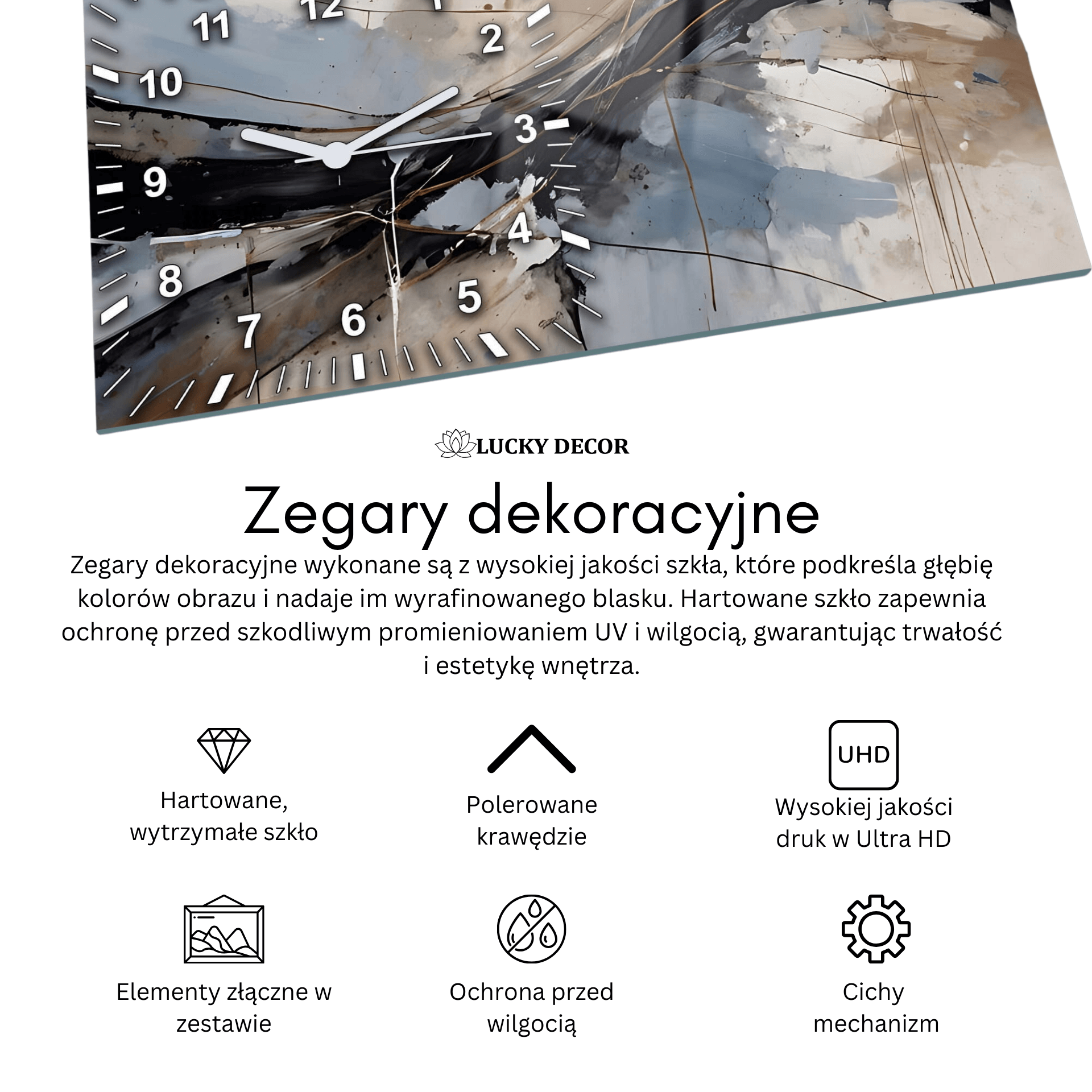 Tak, korzystamy wyłącznie z bezpiecznego szkła hartowanego, które jest odporne na pęknięcia i uszkodzenia mechaniczne. Dodatkowo tylna część szkła jest pokryta specjalną folią ochronną, która zapobiega rozpryskiwaniu się szkła na drobne, ostre kawałki. W przypadku uszkodzenia szkło rozbija się na tępe, niegroźne odłamki, co znacząco zwiększa bezpieczeństwo użytkowania. Nasze zegary dekoracyjne na szkle to nie tylko stylowy, ale i bezpieczny element wyposażenia wnętrz.